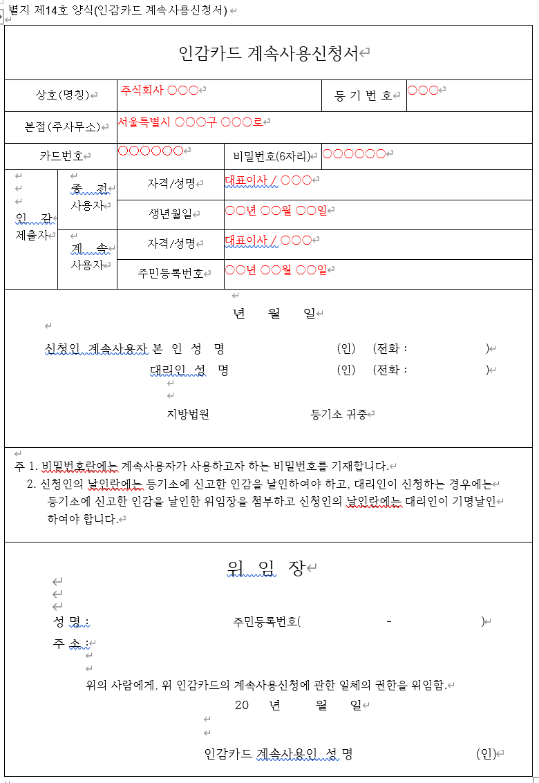 법인인감카드는 한번 발행하면, 분실하지 않는 한 계속 사용할 수가 있는데요. 그렇기 때문에 꼭 등기 완료 후 인감카드를 계속 사용을 신청해야 합니다.