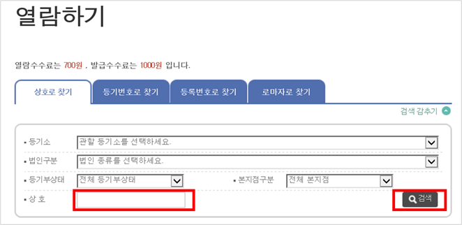 ☞ 등기소와 법인구분을 선택하고, 상호명을 입력한 후 검색합니다.
