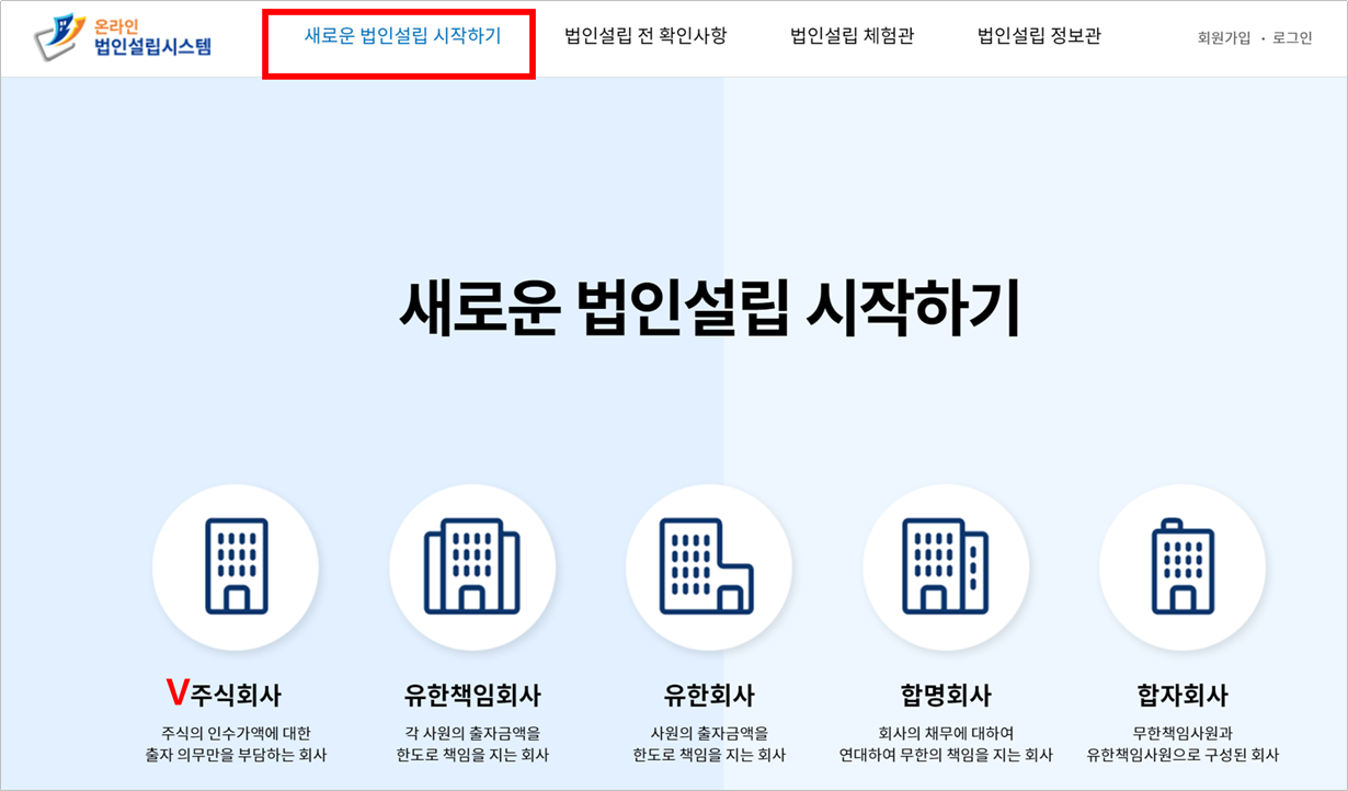 법인설립이 처음이신 분들은 우선 새로운 법인설립하기 메뉴에 가시면 법인 유형별 특징을 확인하실 수 있습니다.