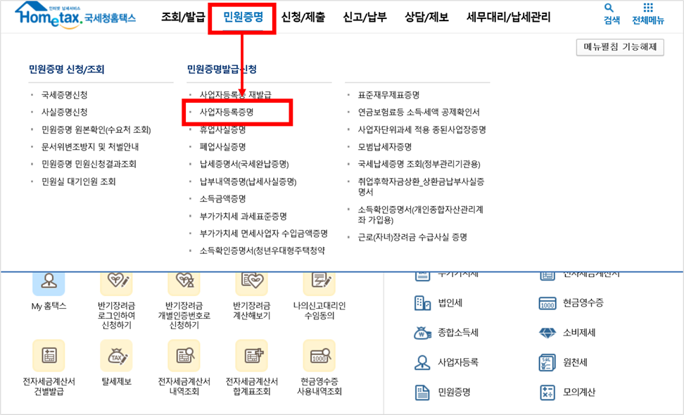 1) 국세청 홈택스에 접속 후, 상단 메뉴 중 「민원증명」 - 「사업자등록증명」을 선택합니다.