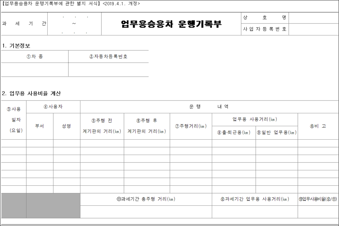 차량운행일지는 국세청에서 제공하는 양식에 따라 업무용승용차운행일지를 작성하셔야 합니다.