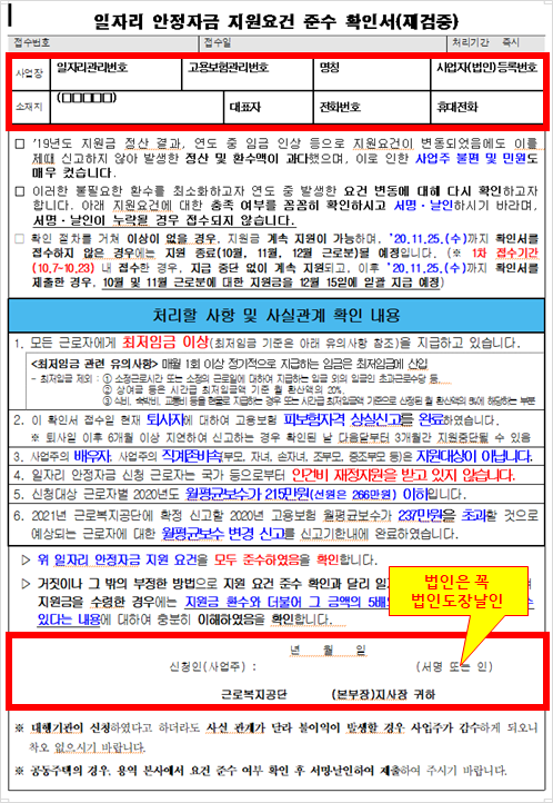 만약 근로복지공단에서 우편물로 발송한 '일자리 안정자금 지원요건 확인서' 양식을 받으셨다면, 그 양식에 작성 및 날인하시면 됩니다.