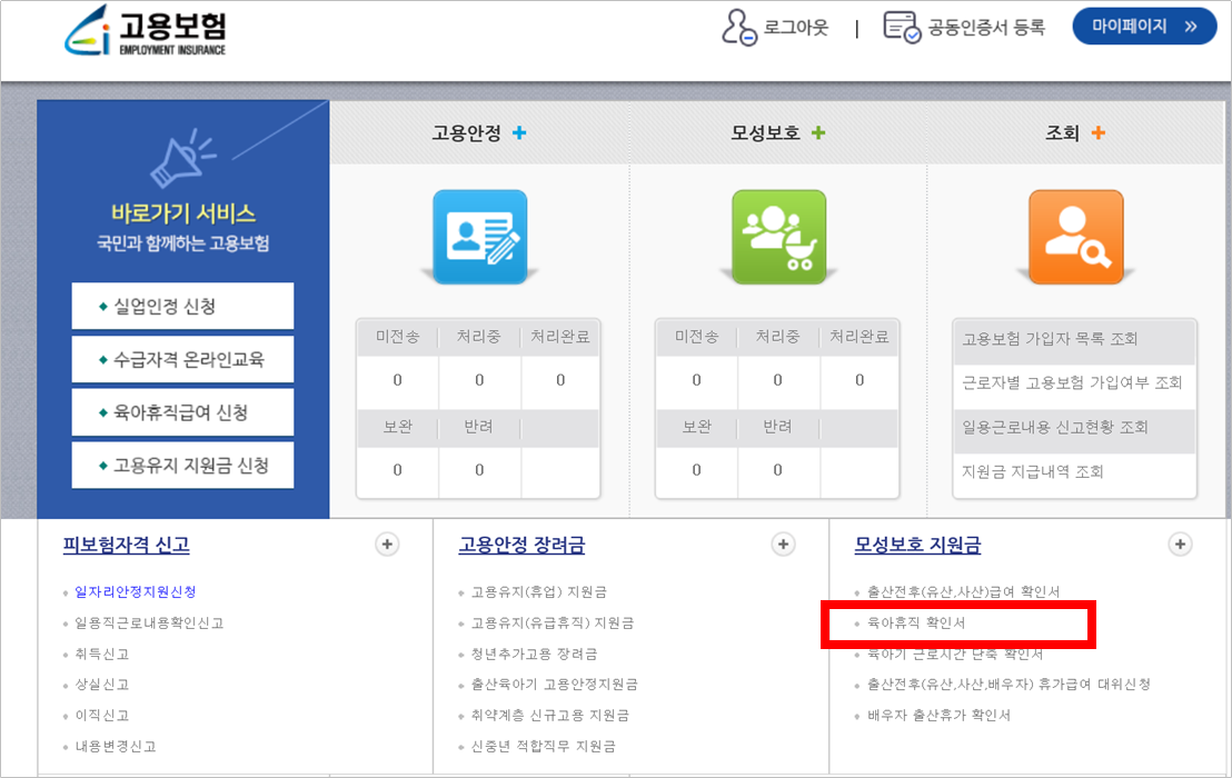 위 서류가 준비되셨다면, 고용보험공단에 로그인을 하신 후 '모성보호지원금' 아래 '육아휴직확인서'를 클릭하세요.