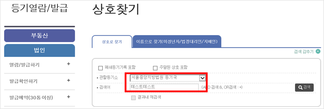(2) 관할등기소에 법인이 위치한 등기국을 선택하고, 검색어에 원하는 상호명을 입력한 후 검색합니다.