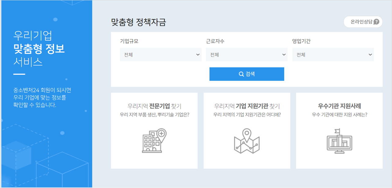 기업의 규모나 근로자 수, 창업 기간에 따라 적합한 정책자금을 검색할 수 있어 맞춤형 정보를 얻을 수 있습니다.