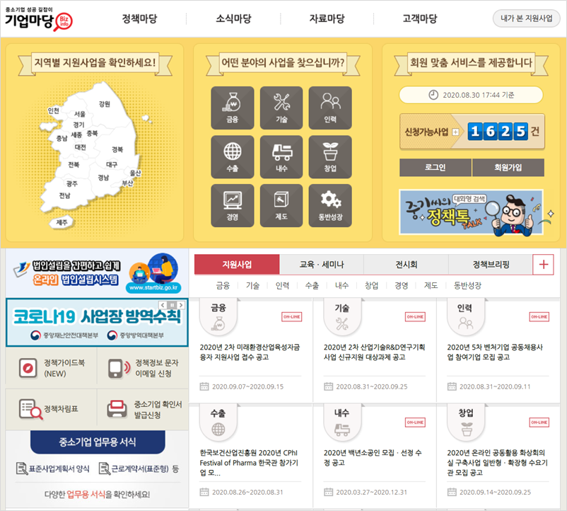 중소기업을 운영하신다면 기업마당에서 자금, 기술, 인력, 수출, 창업, 경영 부분에 대한 지원을 받을 수 있는 사이트입니다.