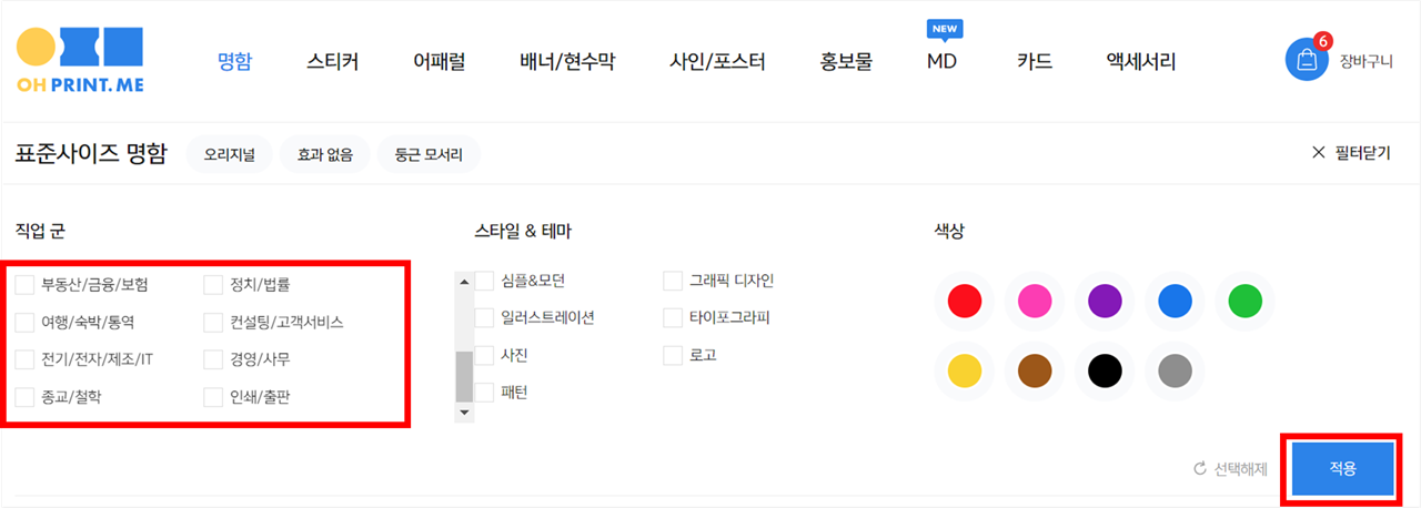 2) 선택한 사이즈의 명함에서 용지와 명함 효과, 모서리, 수량, 액세서리 등의 옵션을 선택합니다.